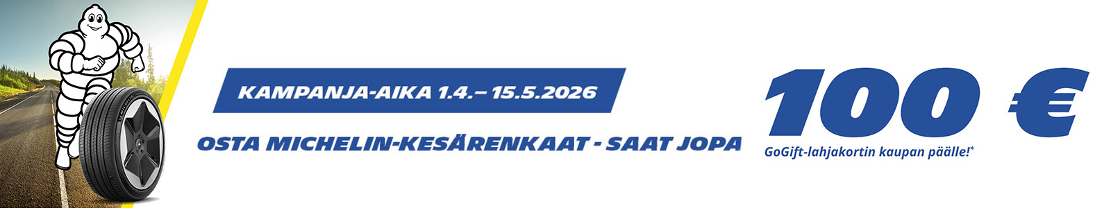 Kampanja koskee uusien Michelin-talvirenkaiden (2 tai 4 kpl) ostoa 1.14.-15.5.2026 välisenä aikana, ja ostaessasi saat rengaskoon mukaan määräytyvän GoGift -lahjakortin. Lahjakortilla voit itse valita käyttökohteen GoGift-verkkokaupasta esimerkiksi vaatteisiin, elektroniikkatuotteisiin, kodinsisustukseen tai matkoihin.